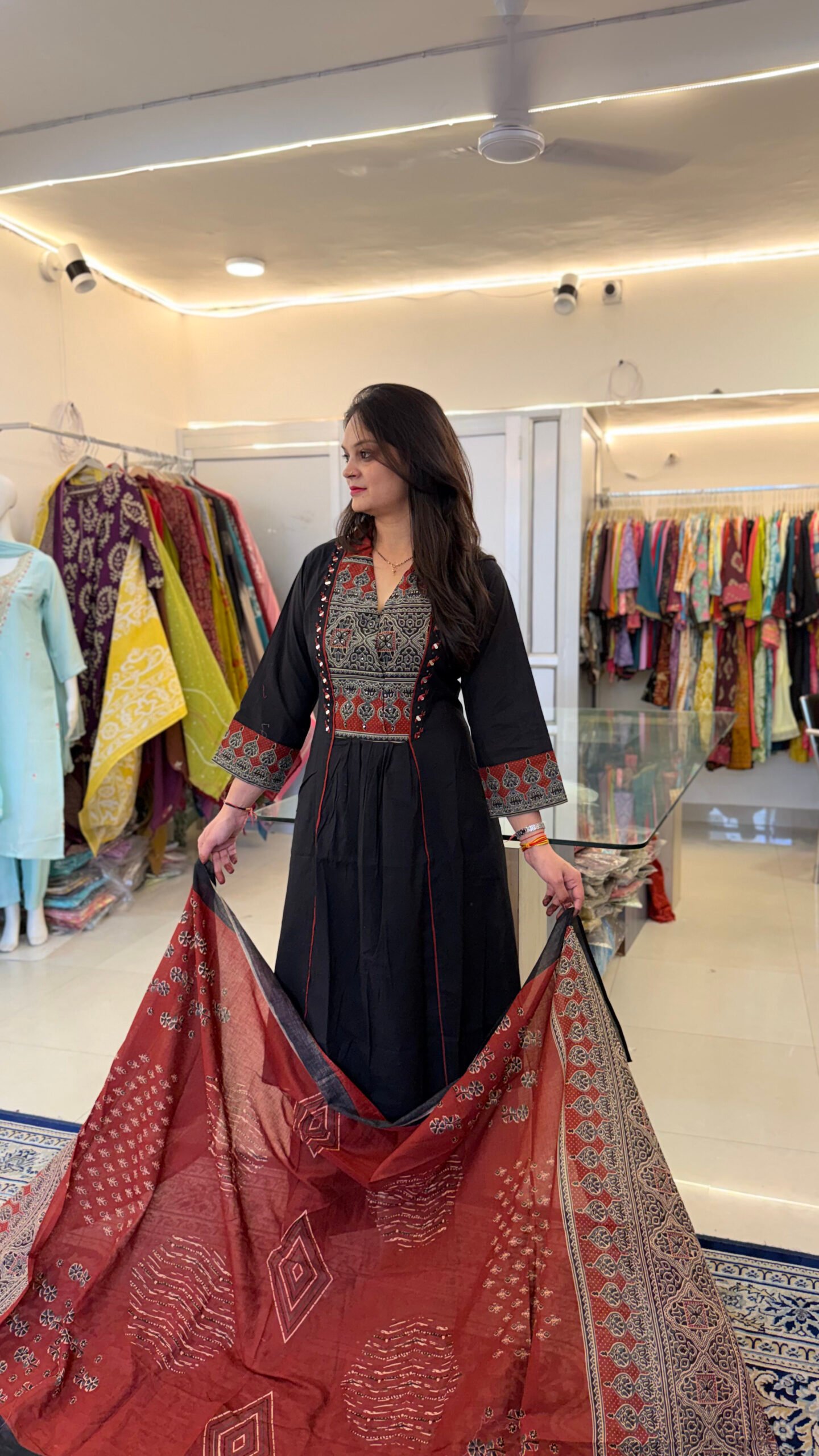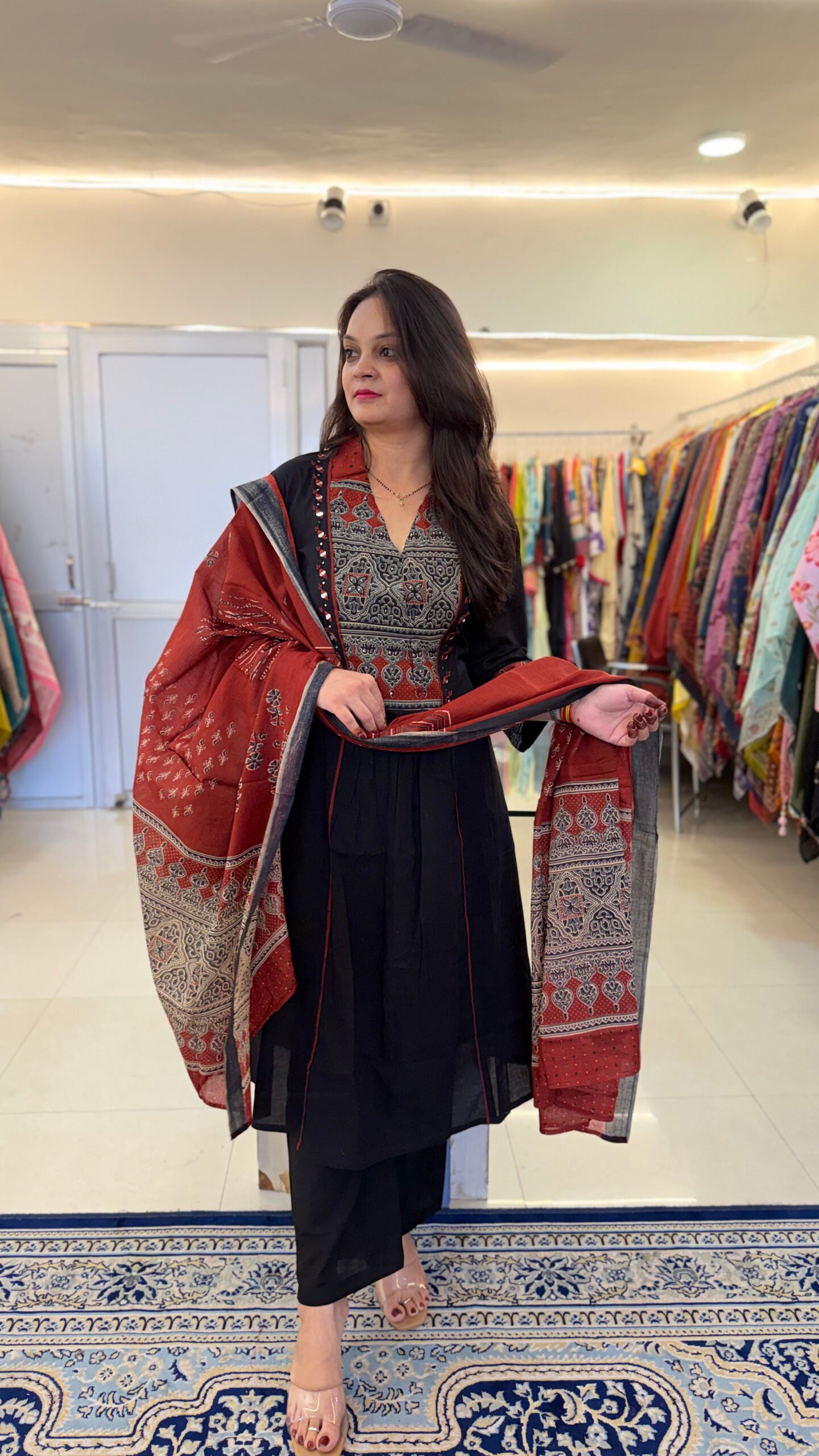 Enhance your ethnic style with this elegant Ajrak Print A-Line Kurti Set with Dupatta, crafted for modern women who love traditional charm. Designed with a flattering A-line silhouette and detailed Ajrak prints, this outfit offers both comfort and style. Perfect for festive occasions, casual outings, and daily wear, the breathable fabric ensures all-day ease while keeping you stylish.