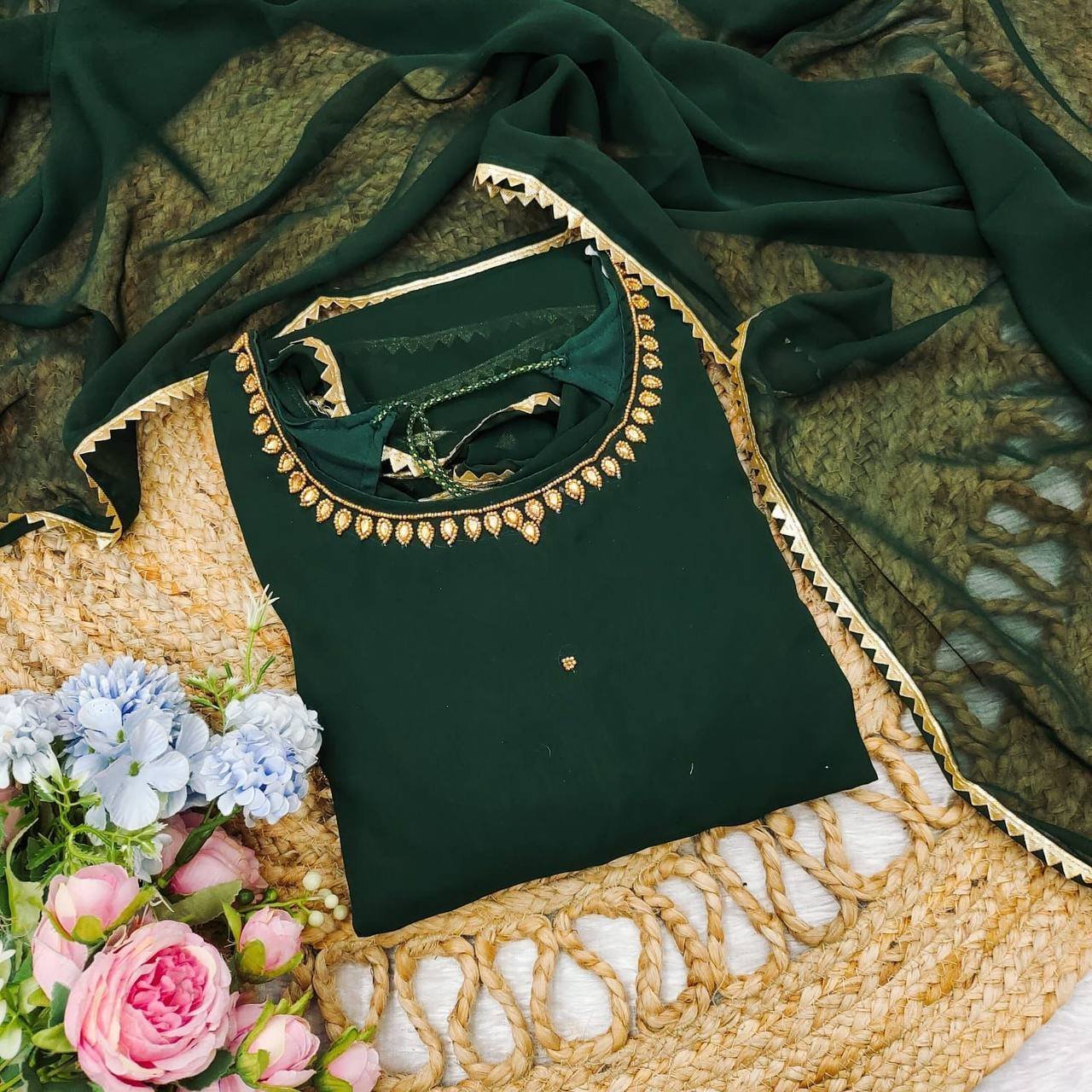 - Fabric: Solid Fox Georgette with Handwork and Mirror Detailing