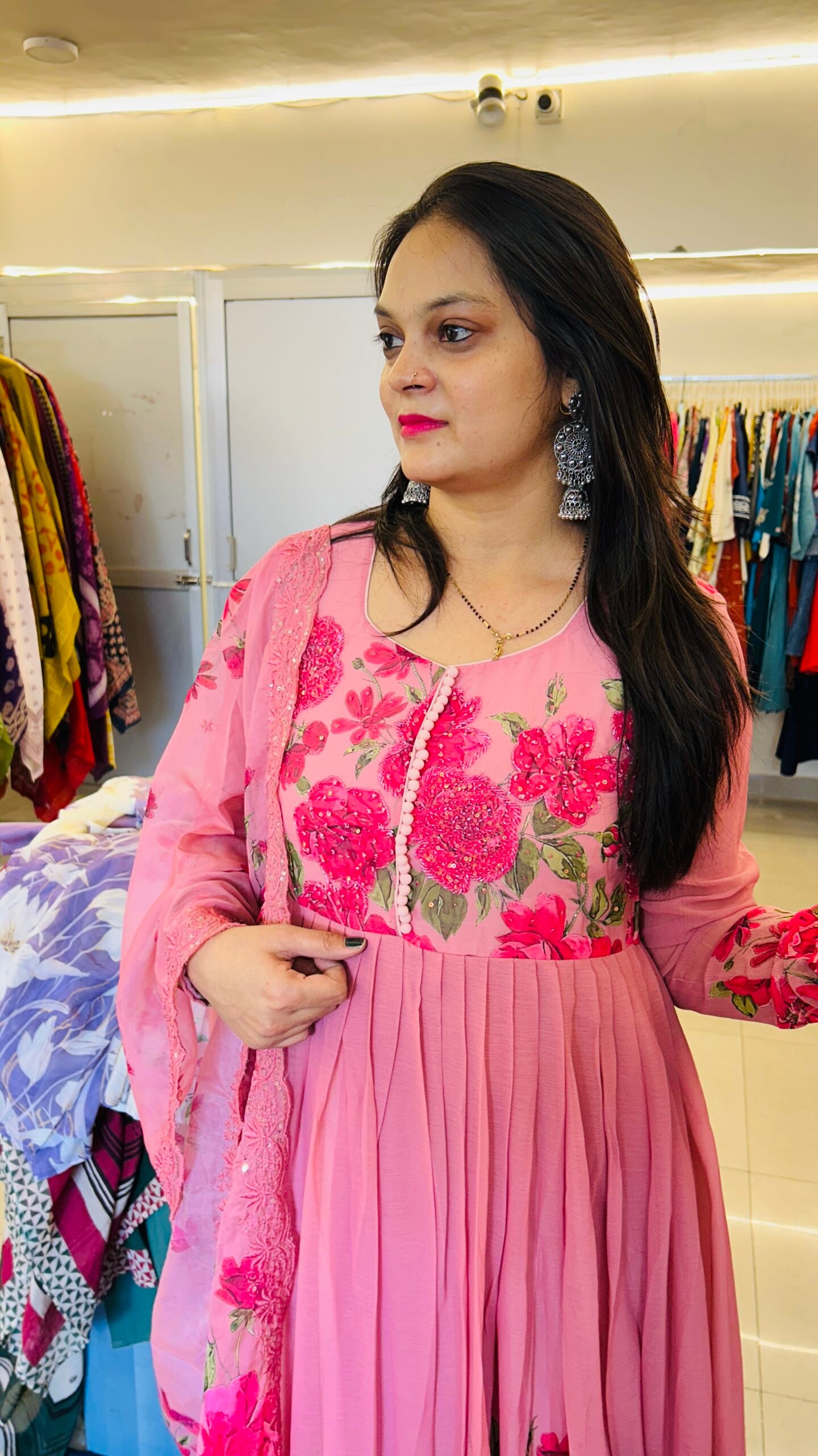 Step into the spotlight with our Floral Chiffon Anarkali, a perfect blend of grace and contemporary style. Crafted from premium, high-quality chiffon, this dress features a vivid flower print that brings a fresh, botanical feel to your ethnic wardrobe. The flowy silhouette ensures a regal look with every step you take.