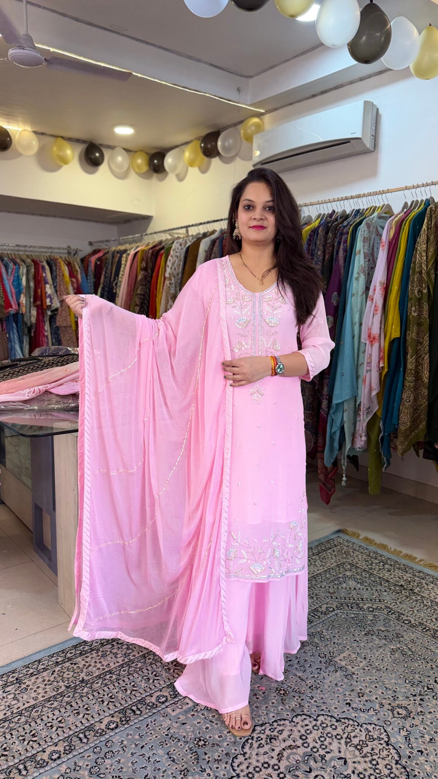 Step into elegance with this stunning Chinon Palazzo Set, designed to give a graceful and sophisticated ethnic look. Made from premium Chinon fabric, this outfit offers a soft, flowy texture that drapes beautifully and enhances your overall style.