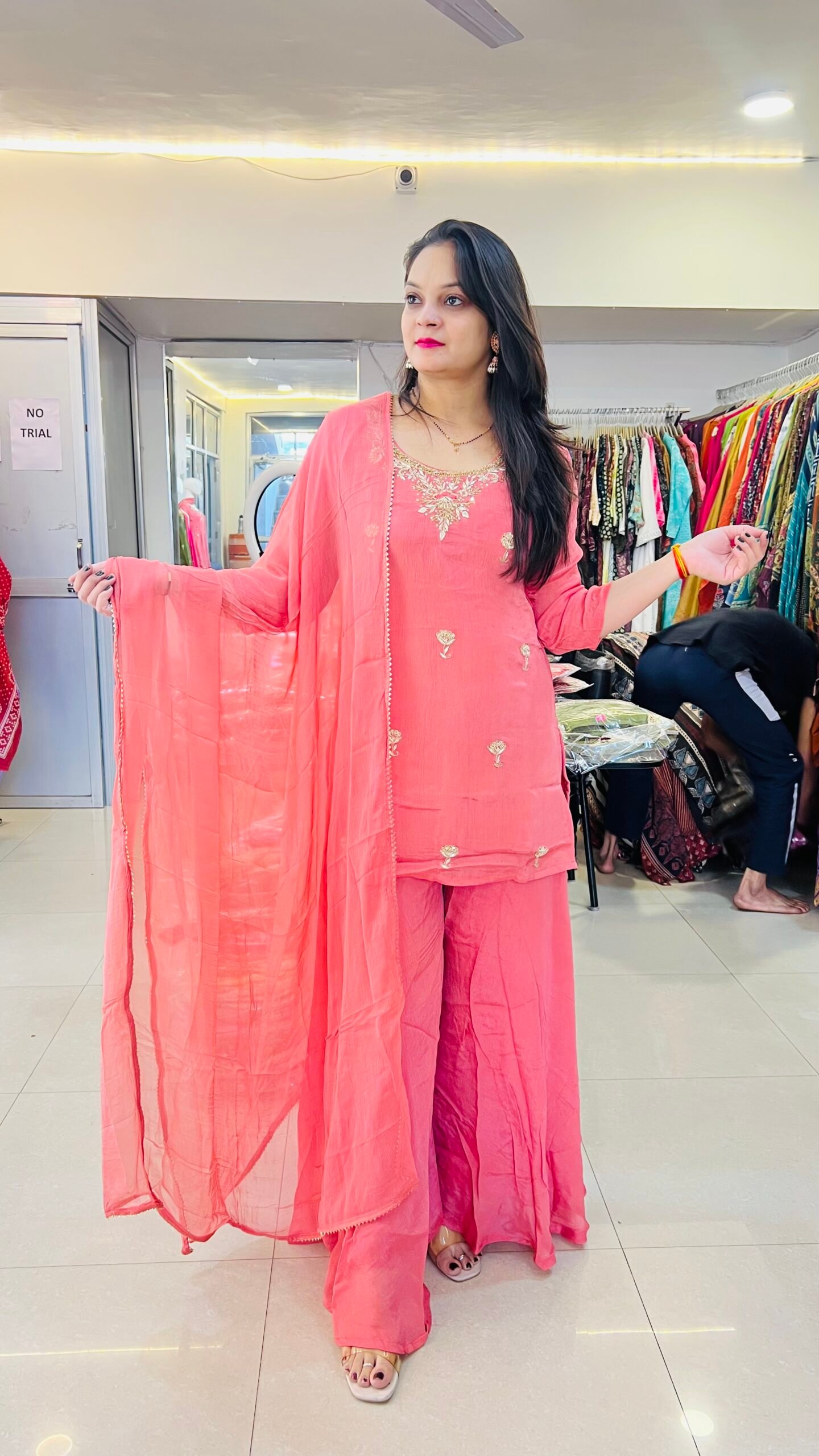 Step into elegance with this stunning Chinon Sharara Party Wear outfit, designed to give you a graceful and festive look. Crafted from premium quality Chinon fabric, this ensemble offers a soft texture, lightweight feel, and a luxurious flow that enhances your overall appearance.