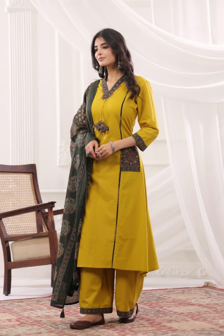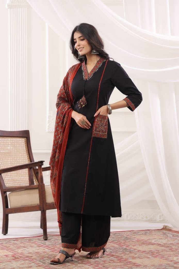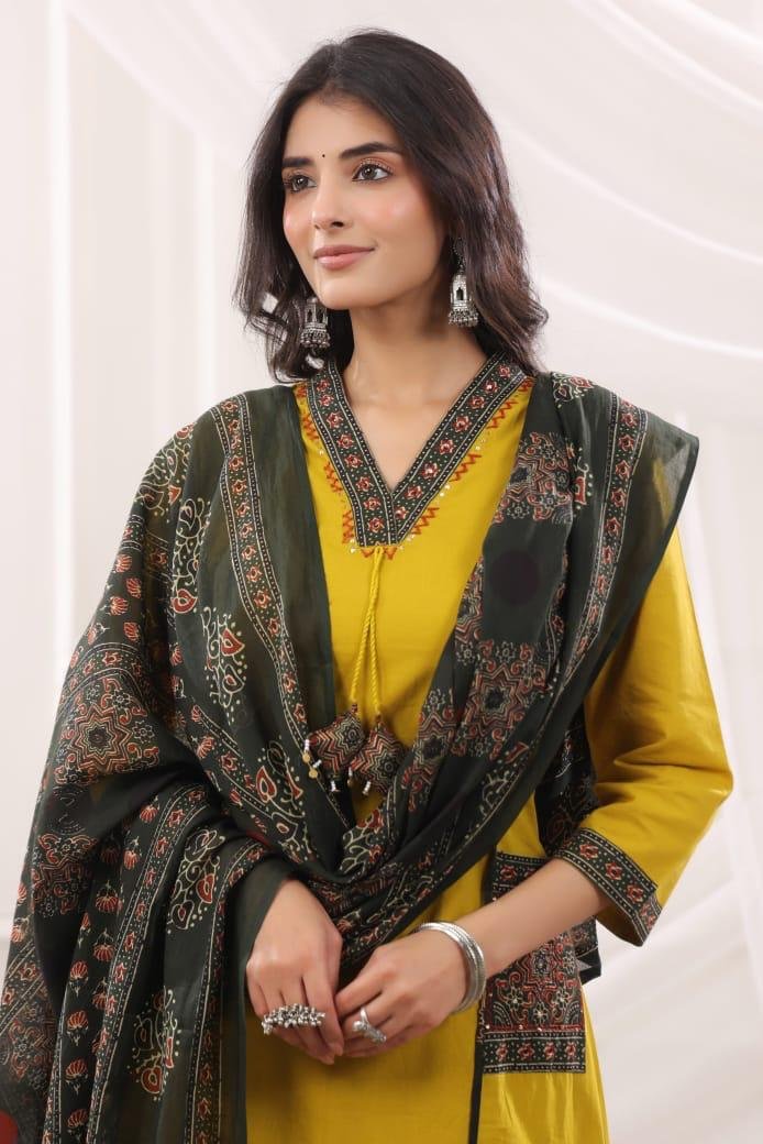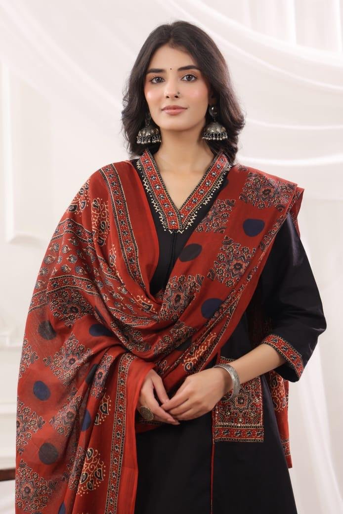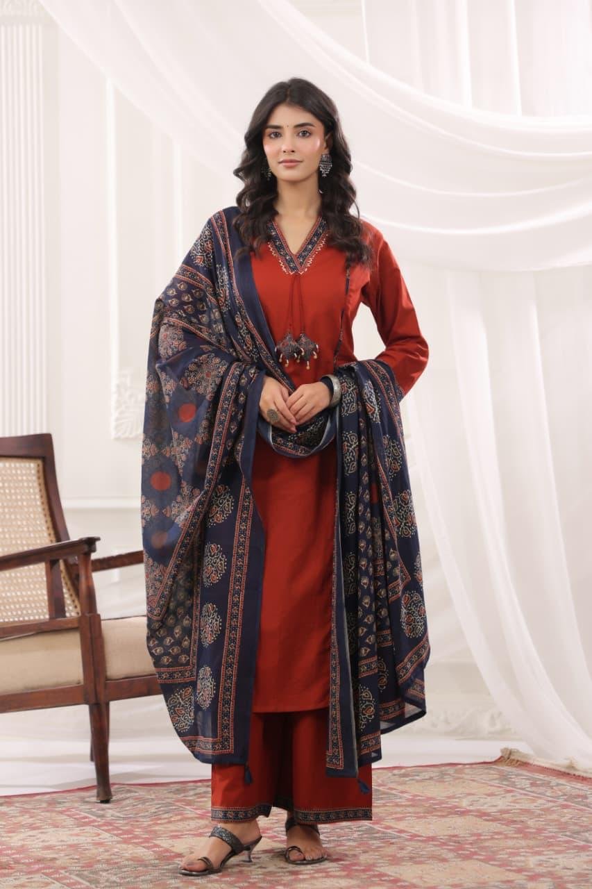 Introducing the Cotton Ajrak Dabbu Print Outfit, designed for women who love traditional artistry with everyday comfort. Crafted from premium cotton fabric, this outfit features beautiful Ajrak and Dabbu prints that bring a rich, ethnic charm. Its soft and breathable feel makes it perfect for daily wear, casual outings, and effortless ethnic styling.