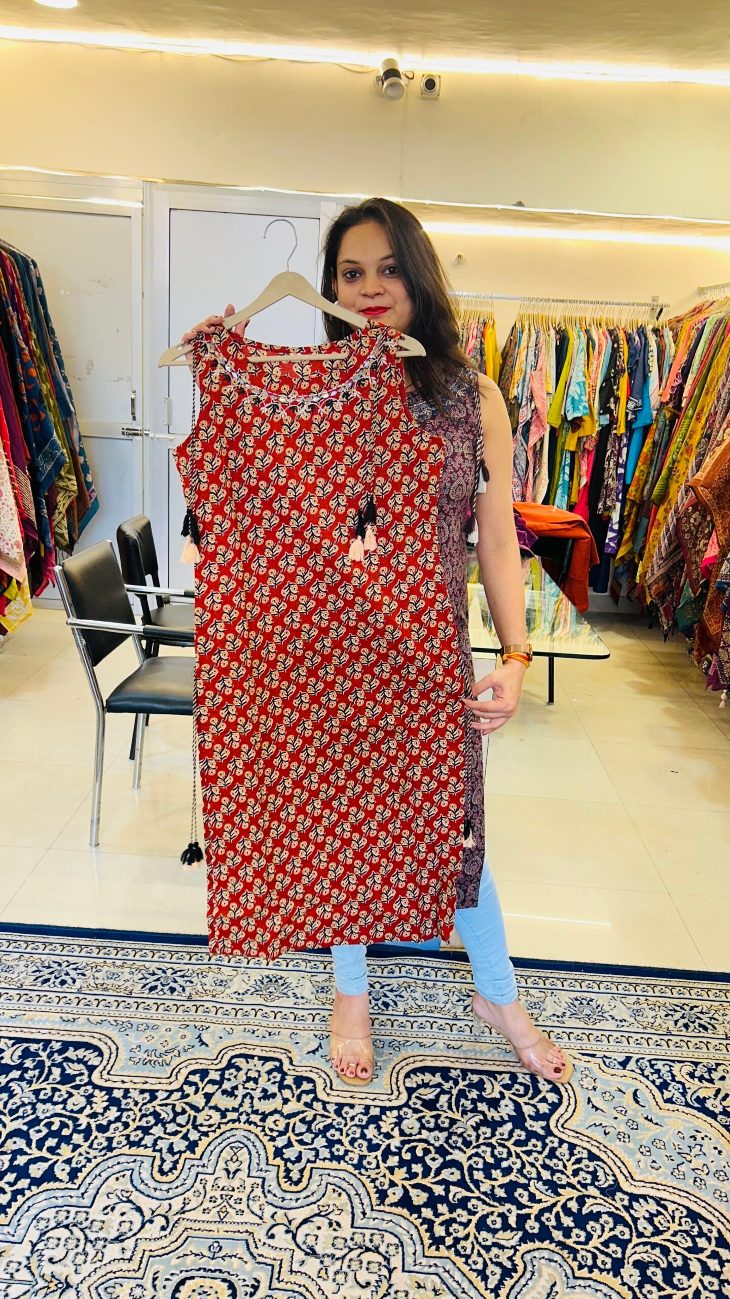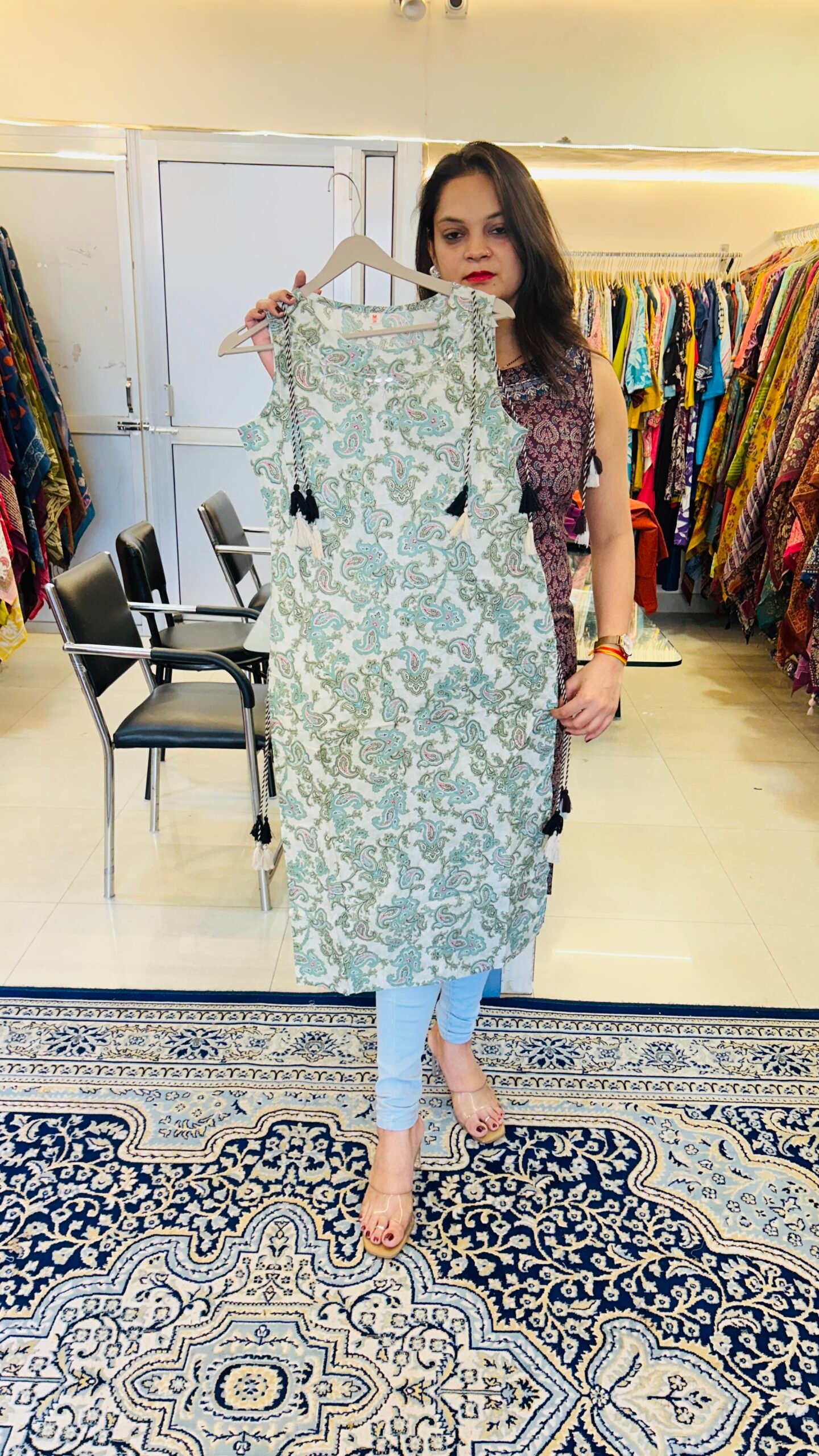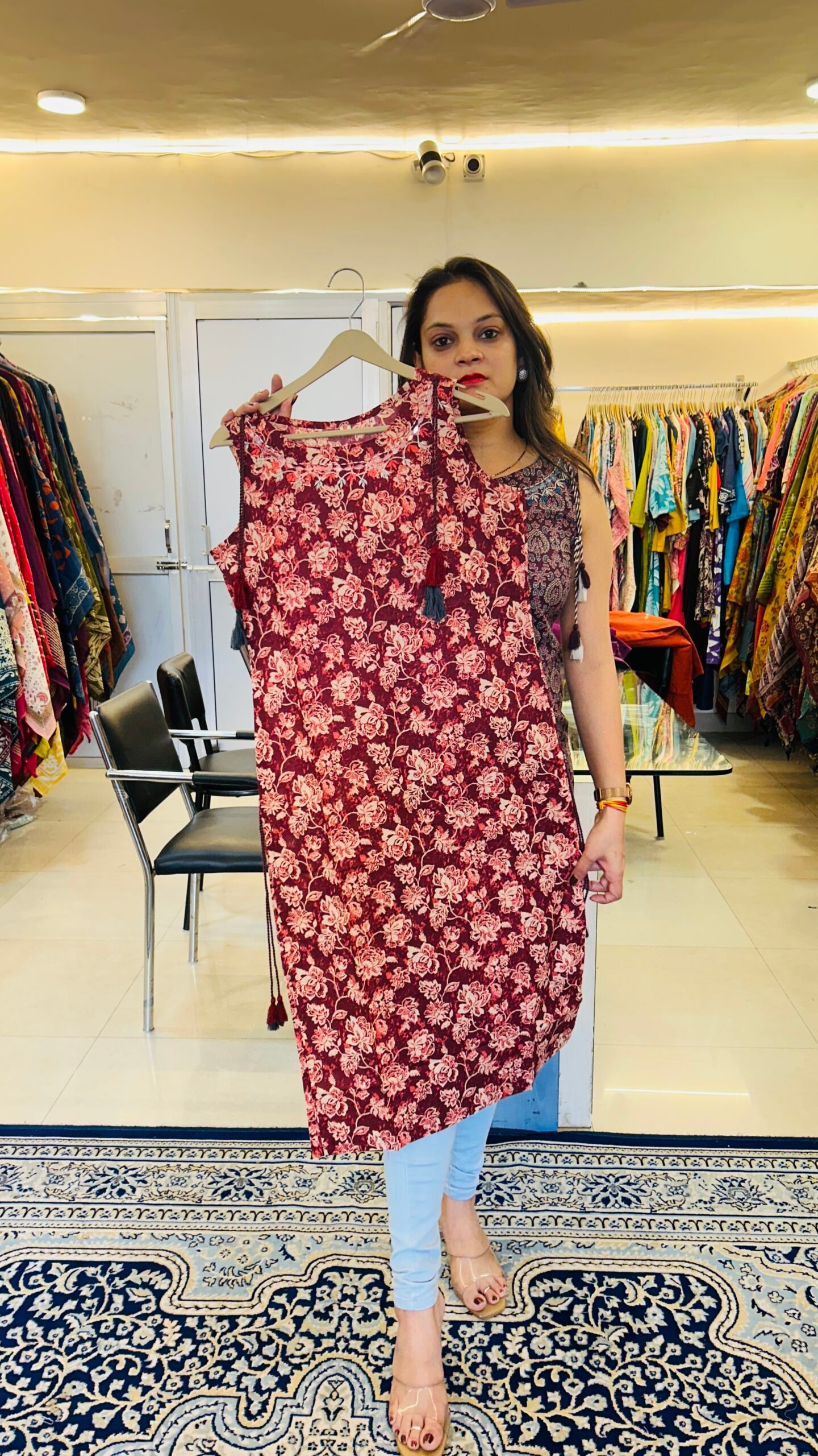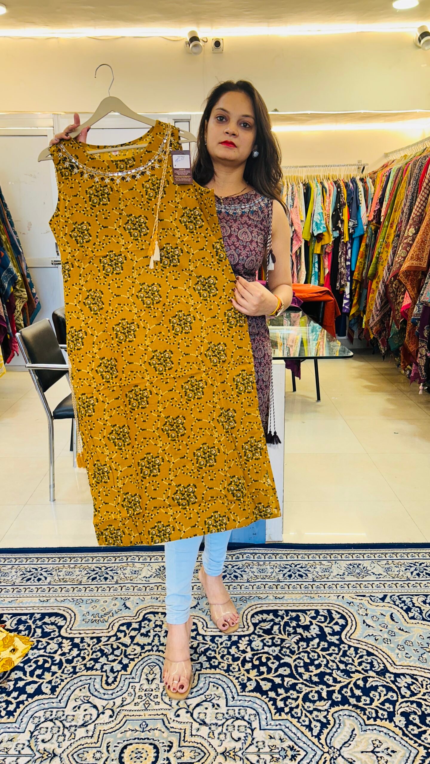 Style this kurti with palazzo pants, straight pants or denim to create a chic Indo-fusion outfit that is both fashionable and comfortable.