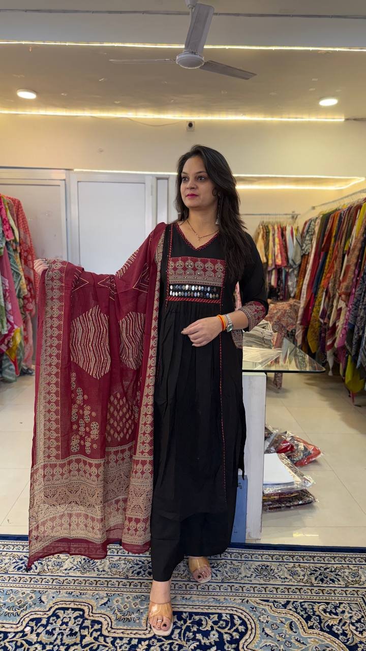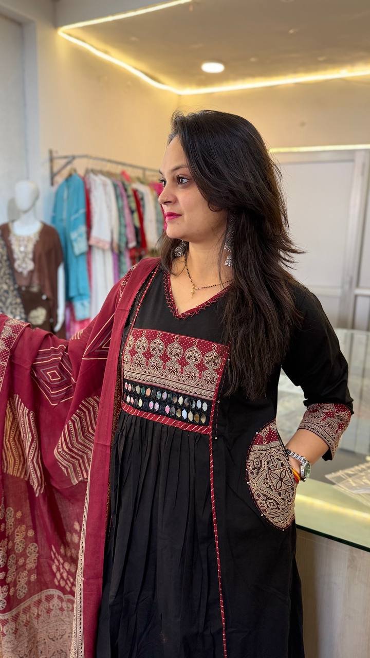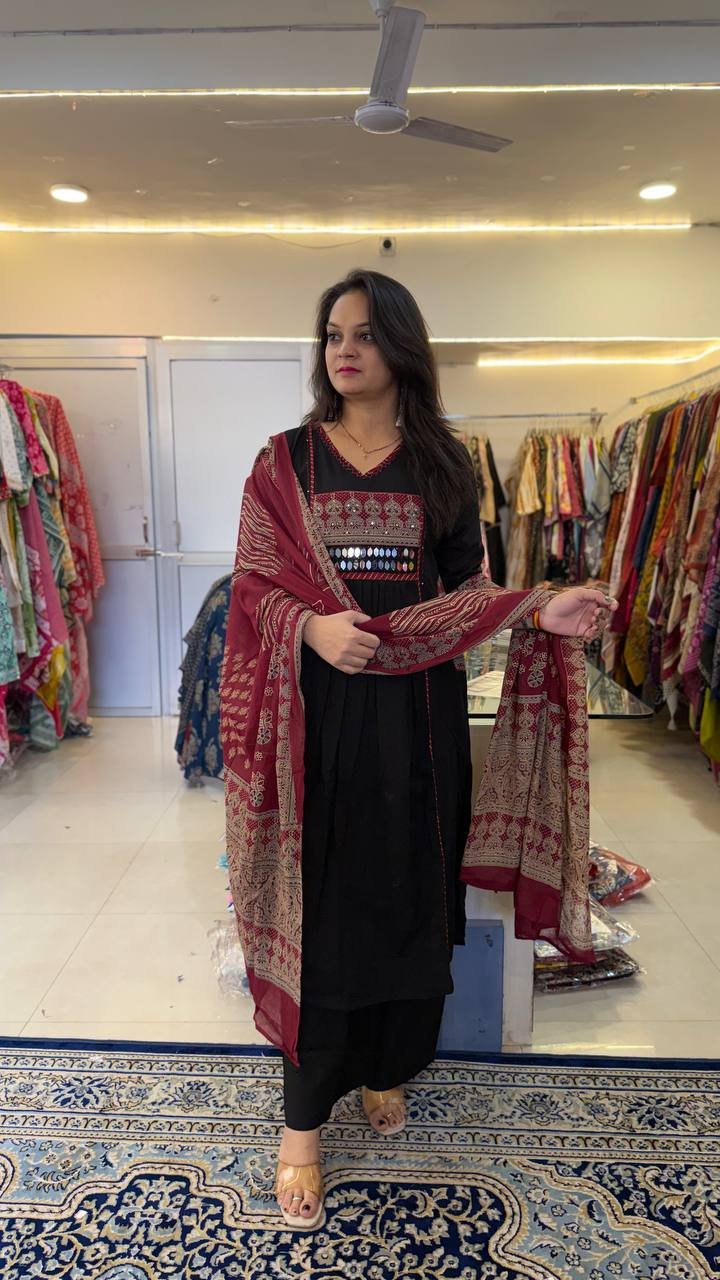 Add a touch of traditional elegance to your wardrobe with this Premium Taj Cotton Ajrakh Dabu Print Suit with Mirror Work. Crafted from soft and breathable Taj cotton fabric, this outfit offers comfort along with authentic ethnic charm.