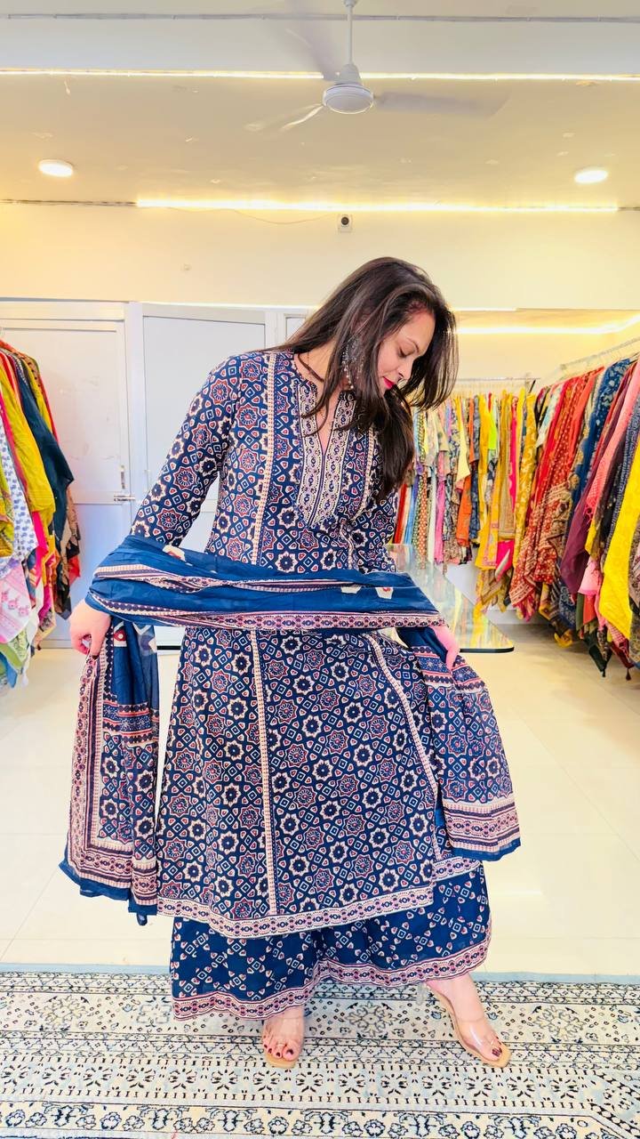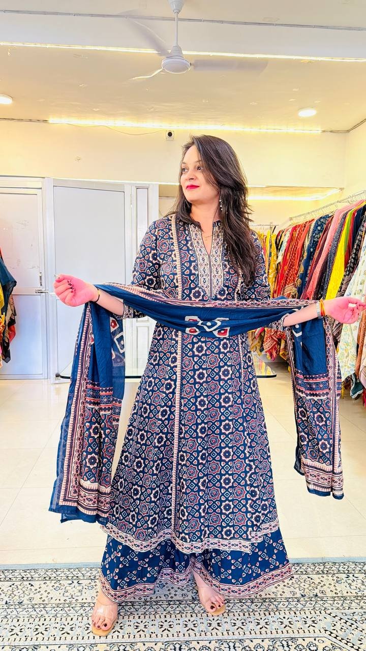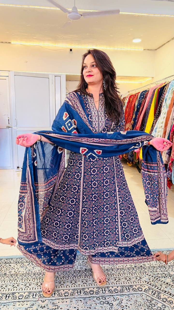 Introducing the New Launch Taj Cotton Ajrak Print Anarkali, designed for women who appreciate traditional patterns with modern comfort. Crafted from premium Taj cotton fabric, this Anarkali features beautiful Ajrak prints that give it a rich ethnic look. The soft and breathable fabric combined with the graceful Anarkali silhouette makes it perfect for festive occasions, casual gatherings, and everyday ethnic styling.