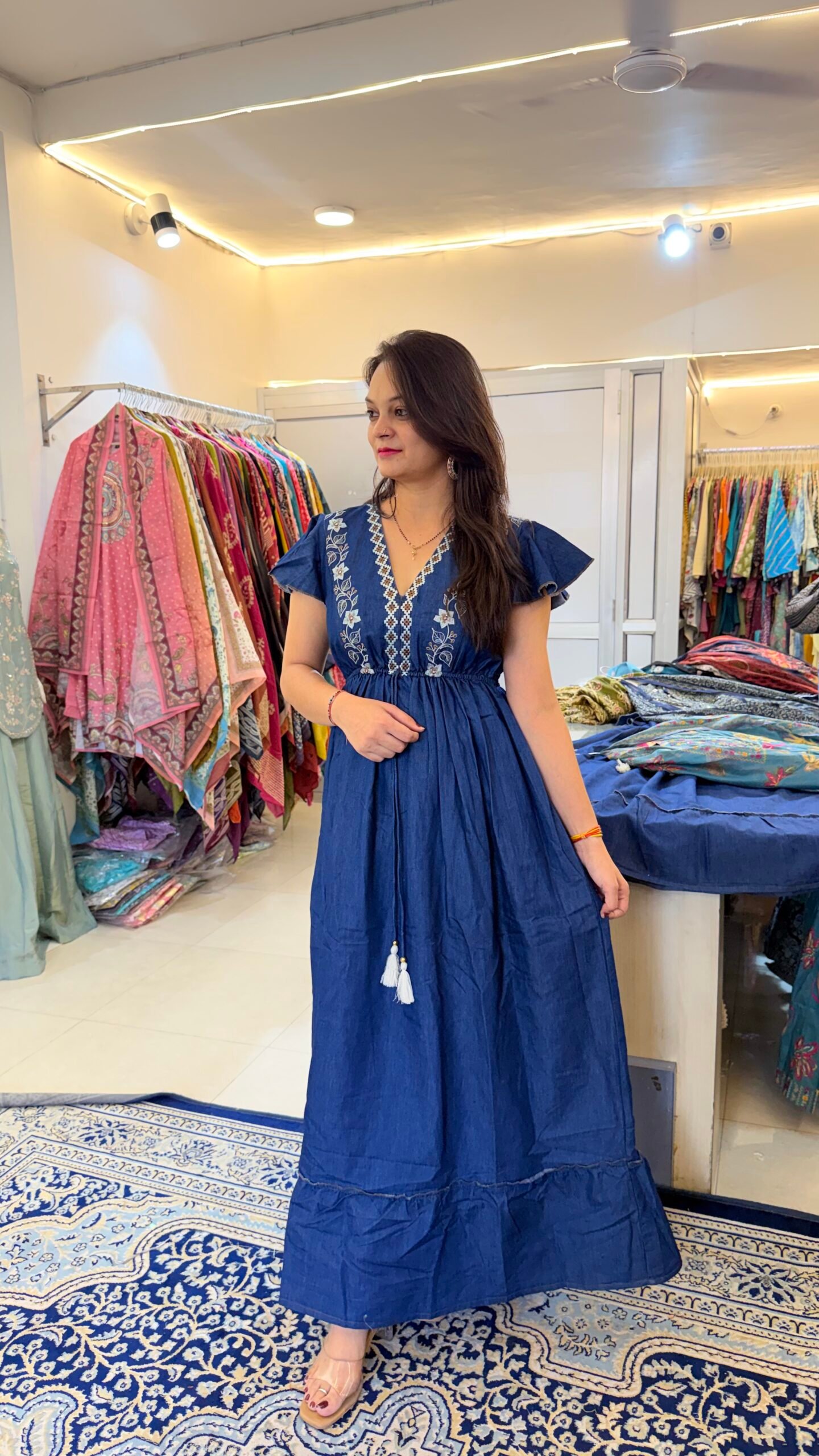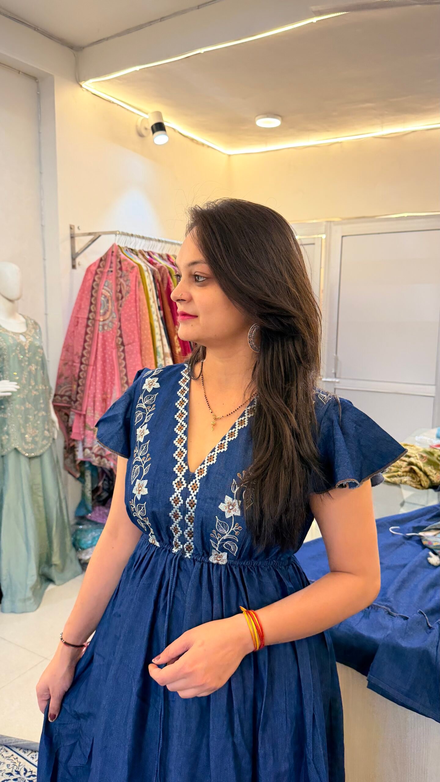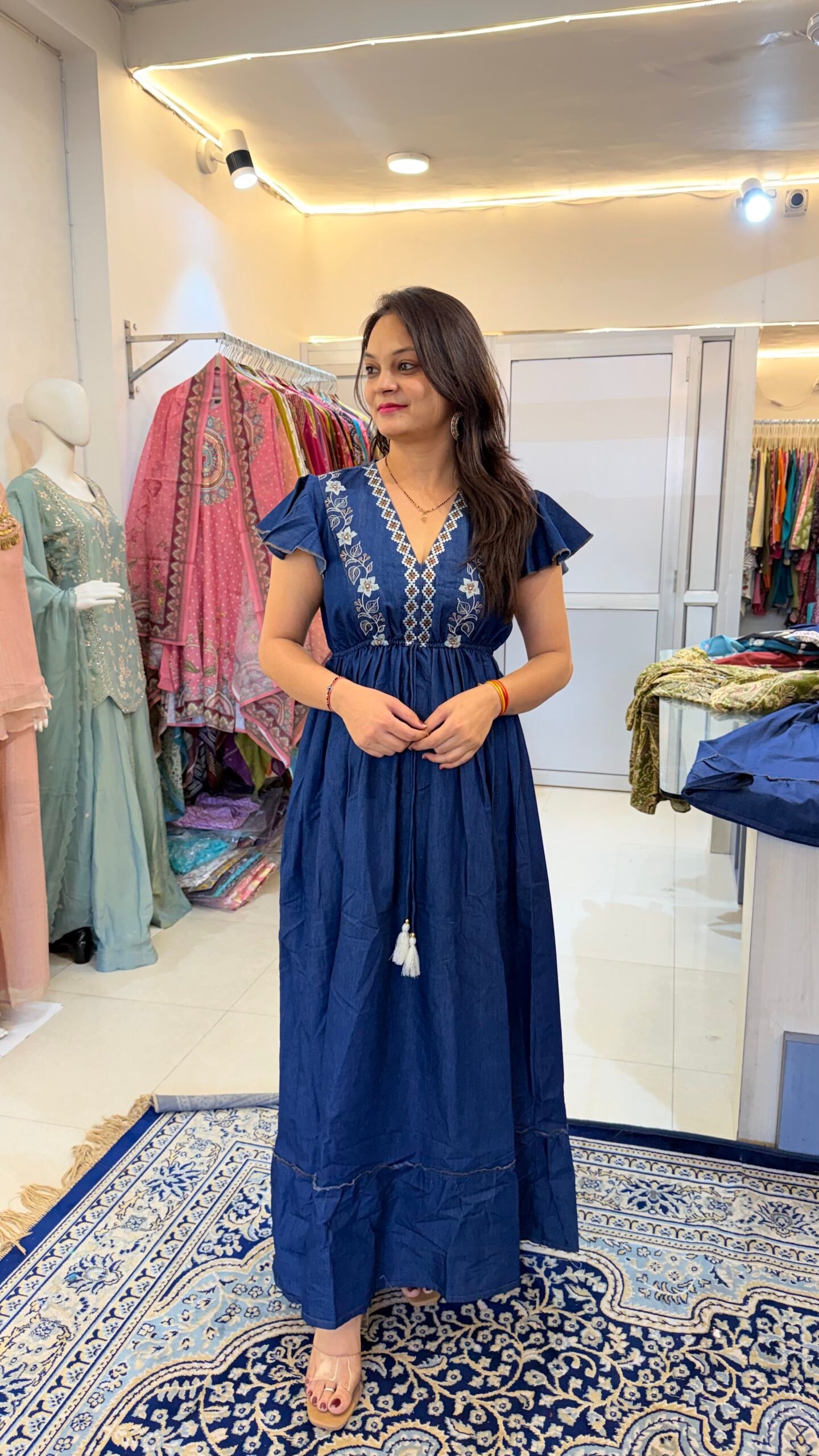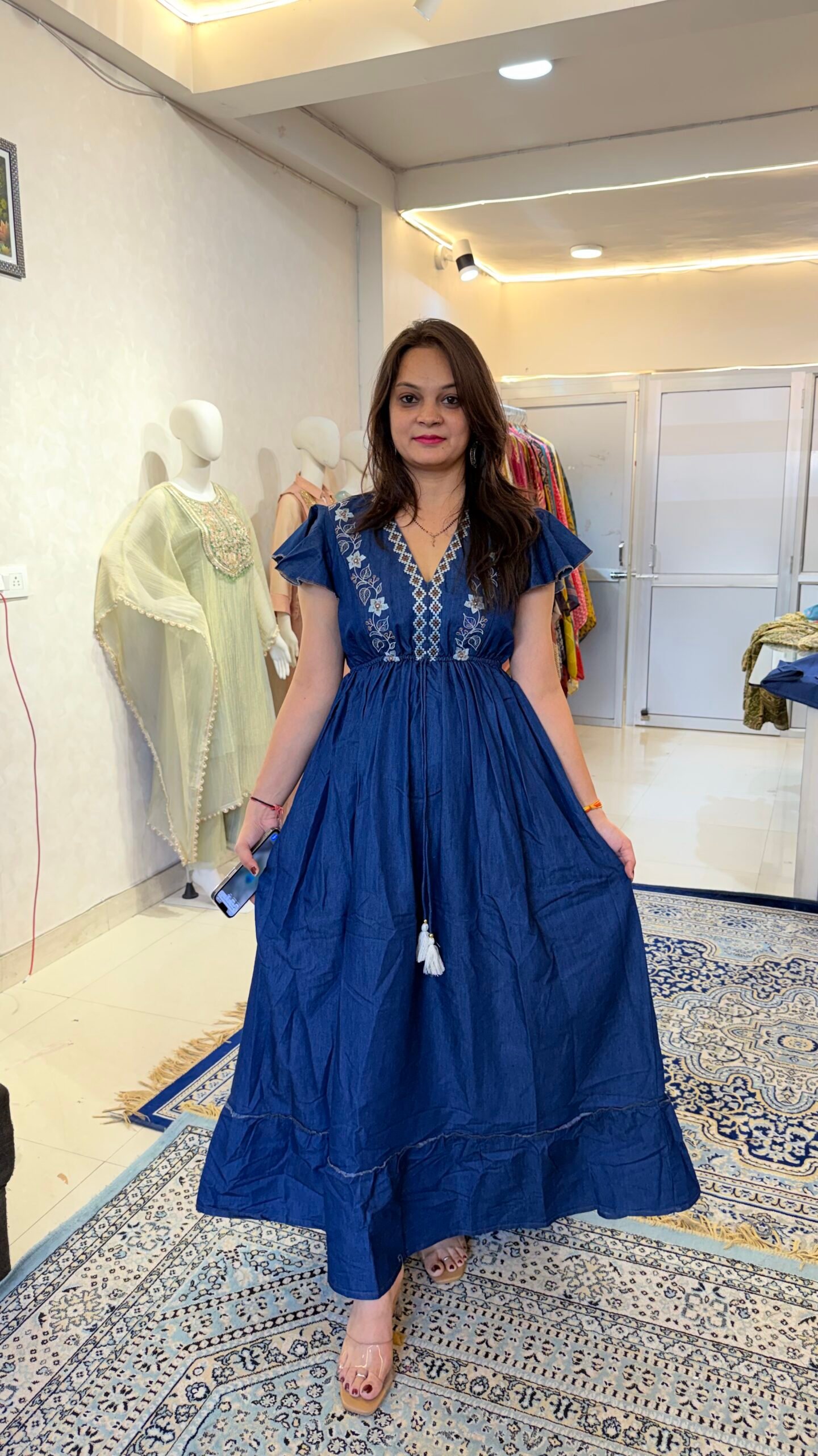 This Premium Denim Indo-Western Gown is designed for women who love blending contemporary fashion with ethnic elegance. Crafted from high-quality denim fabric, the outfit offers a structured yet comfortable feel while creating a striking modern look.