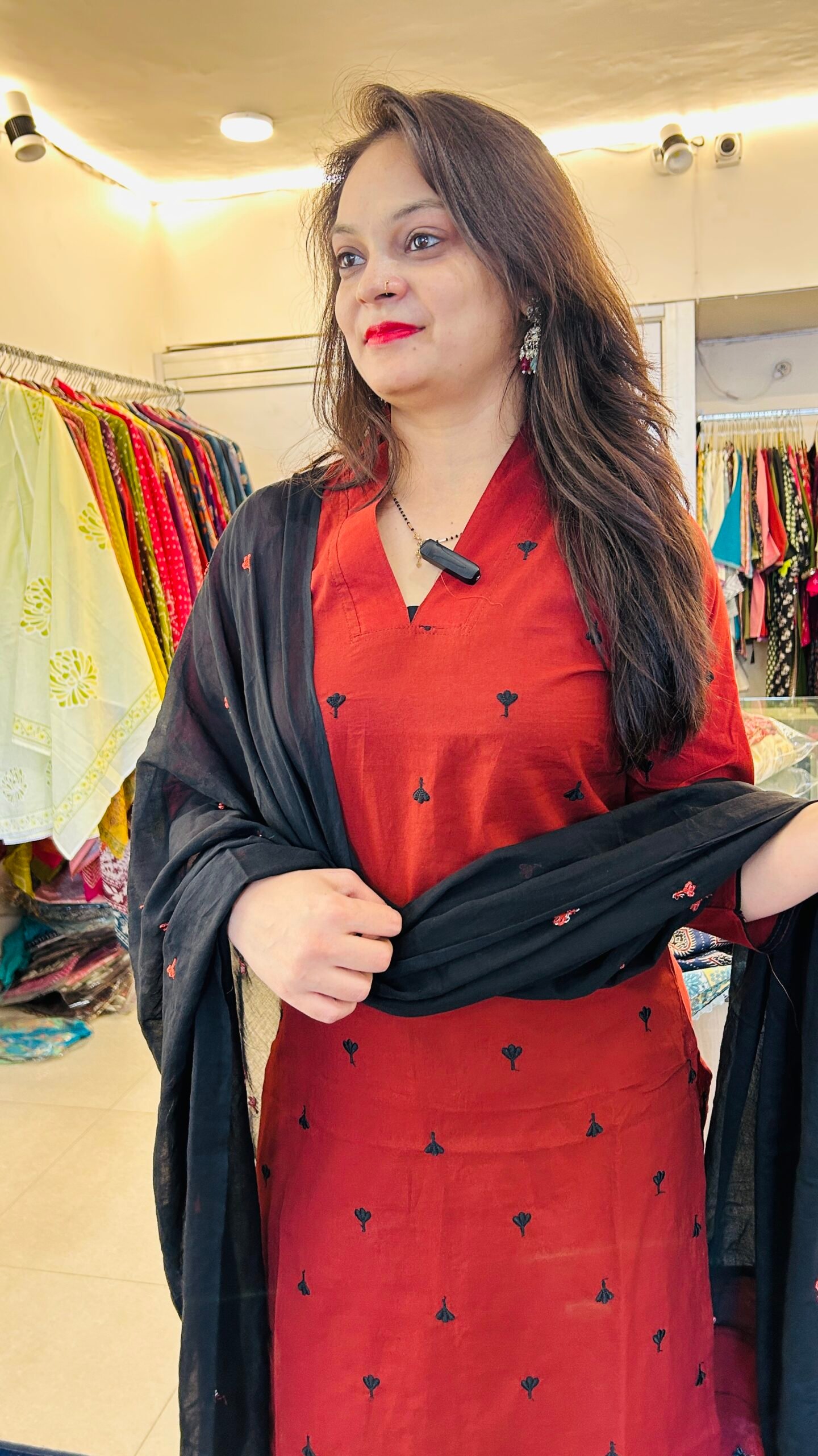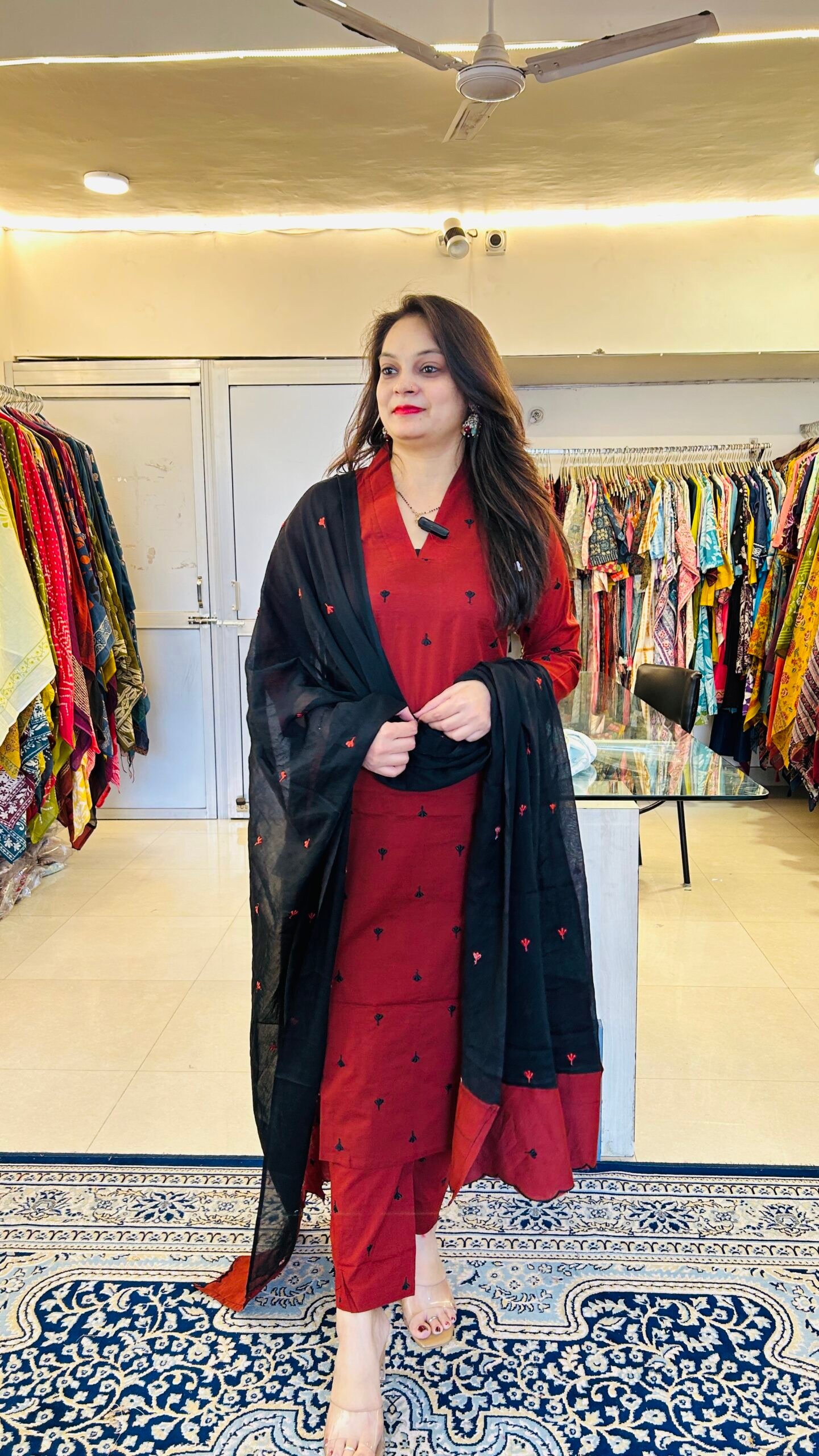 Paired with minimal earrings or a delicate necklace for a clean elegant look, and styled with classic juttis, comfortable Kolhapuri sandals, or subtle block heels to create a smart ethnic outfit perfect for office wear and casual outings.