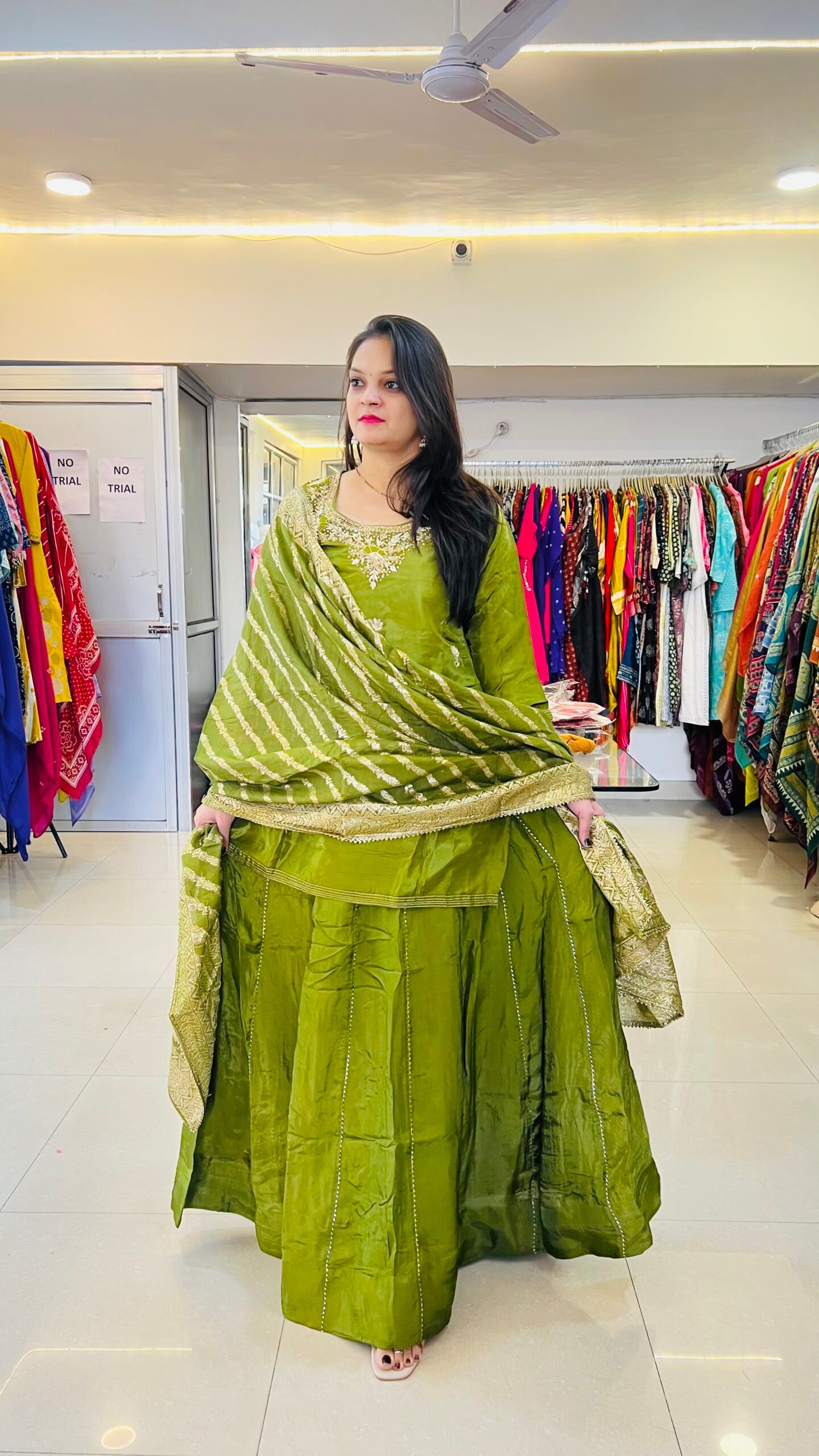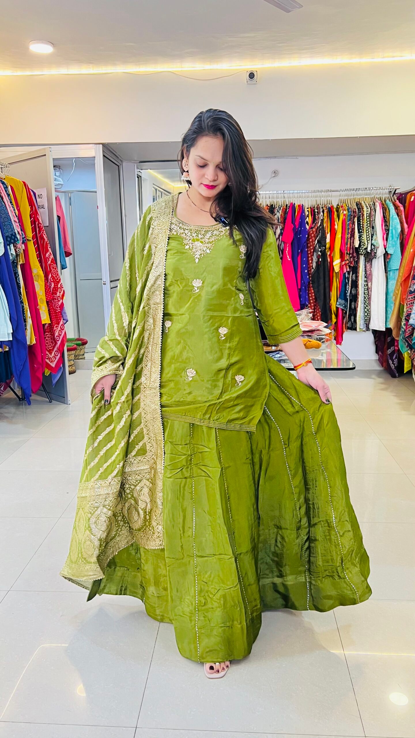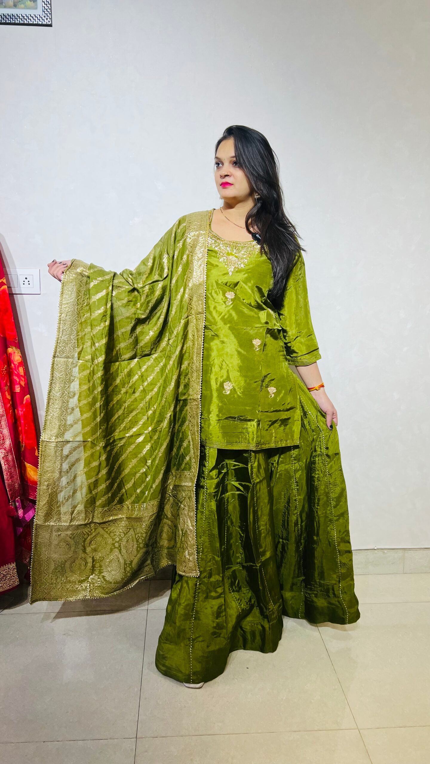 The elegant design and flattering fit make this green palazzo set an ideal choice for weddings, festive gatherings, family functions, and evening parties. Pair it with statement jewellery and heels to create a stunning traditional look.