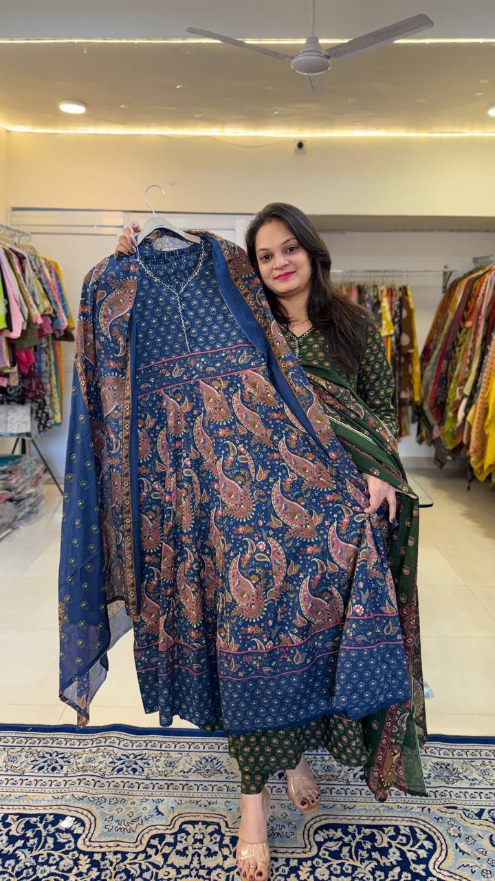 Introducing the New Launch Taj Cotton Ajrak Print Anarkali, designed for women who love traditional prints with elegant comfort. Crafted from premium Taj cotton fabric, this Anarkali features beautiful Ajrak prints that give it a rich and timeless ethnic look. The soft and breathable fabric combined with the graceful Anarkali silhouette makes it perfect for festive occasions, casual gatherings, and stylish everyday wear.