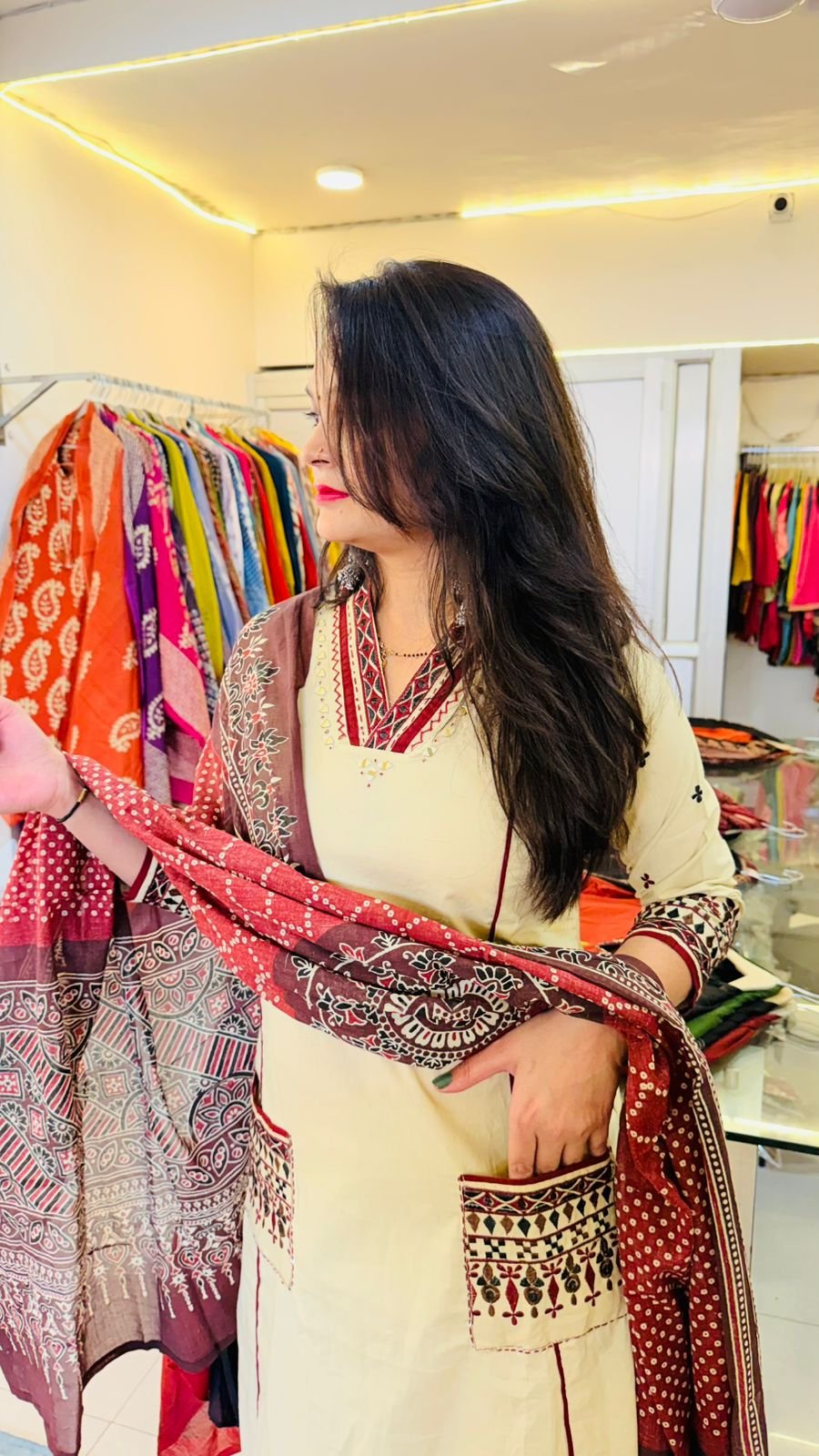 This Taj Cotton Dabu Print Kurti celebrates the beauty of traditional Indian craftsmanship with a modern ethnic touch. Made from breathable Taj cotton, the fabric feels soft, airy, and perfect for everyday comfort.